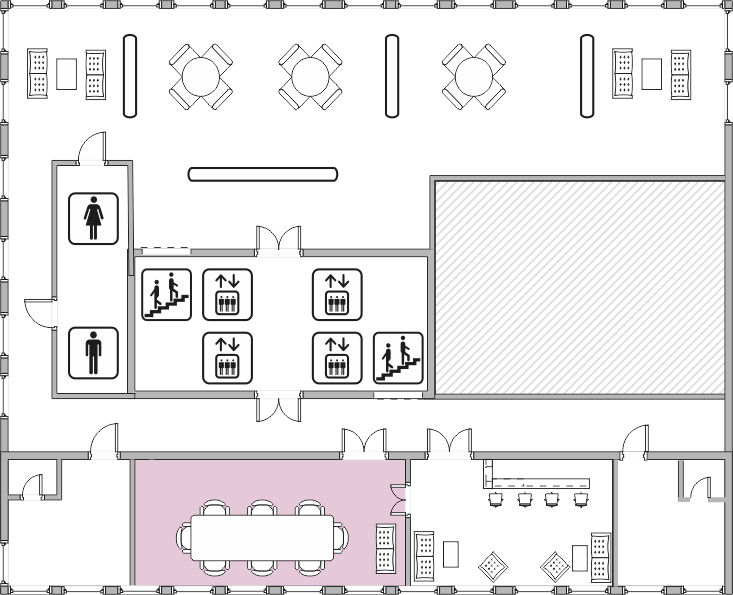 Благодаря прямому выходу в соседний Queens Lounge, оба зала можно объединить под одно мероприятие, предусмотрев фуршет в одном, а официальную часть или основной банкет в другом помещении.